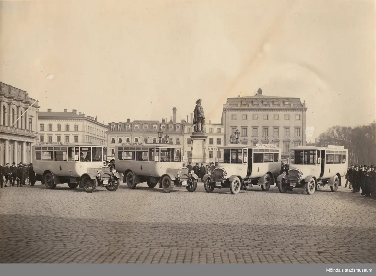 Omnibussar (ålderdomliga bussar för persontrafik) "Lundby -Hultmans Holme" uppställda på Gustav Adolfs torg.