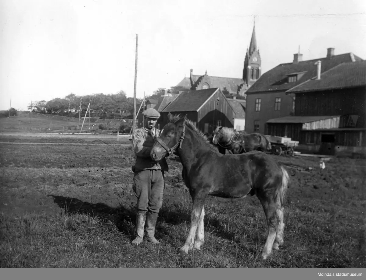 Man med föl. I bakgrunden Åby Frälsegården och Fässbergs kyrka.