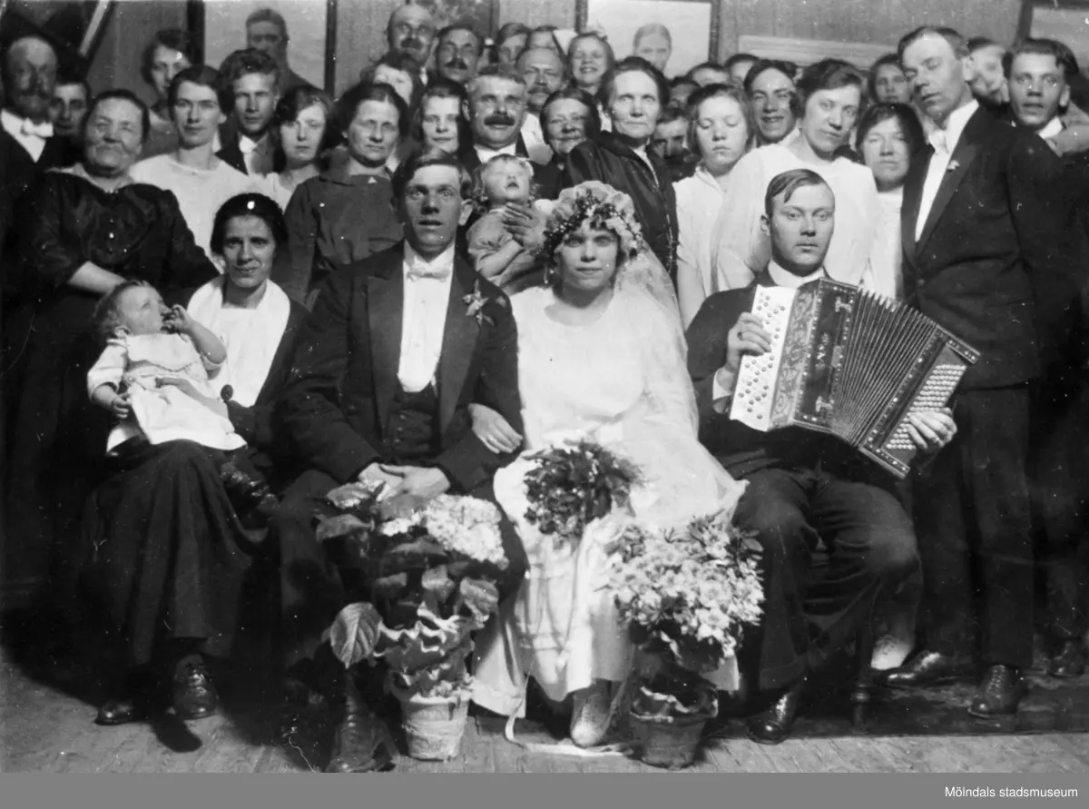 Bröllopsfoto av brudpar, släkt och spelman, okänd plats och årtal. Bruden är Helga Börjesson, född Lidman.
