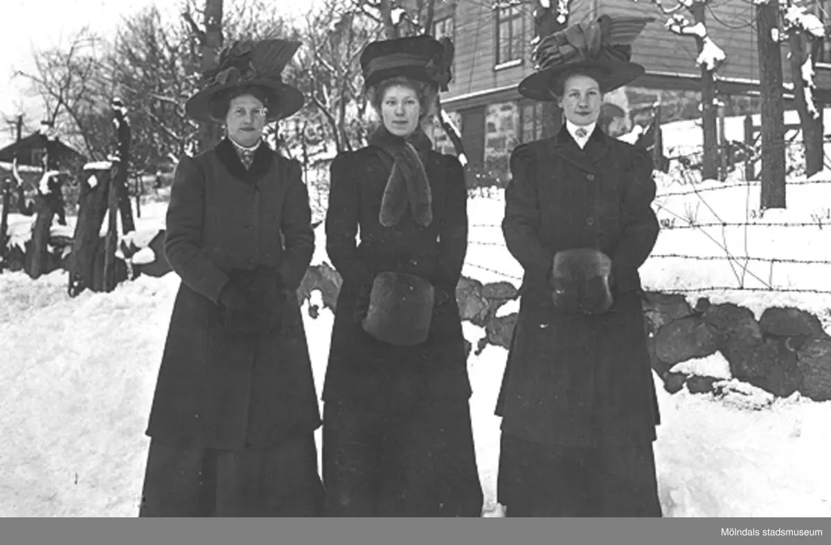 Tre damer med pälsmuffar och stora hattar på vinterpromenad.