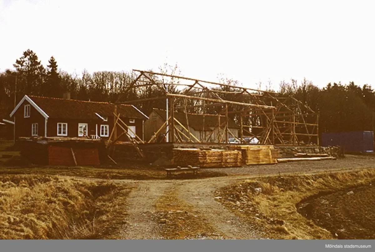 Långåkers lada, som har flyttats från Verner Carlssons gård i Tollered, återuppbyggs, april 1993.