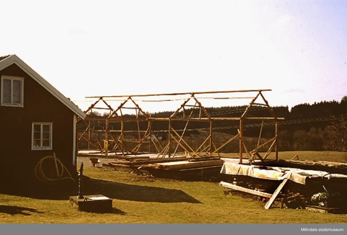 Långåkers lada, som har flyttats från Verner Carlssons gård i Tollered, återuppbyggs, april 1993. Relaterade motiv: 2003_0345 - 0348.