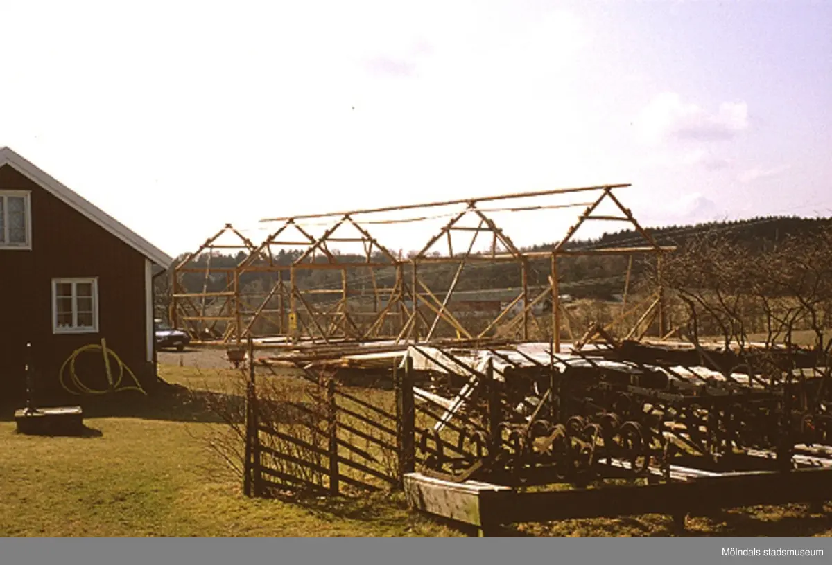 Titel: Långåkers lada, som har flyttats från Verner Carlssons gård i Tollered, återuppbyggs, april 1993.