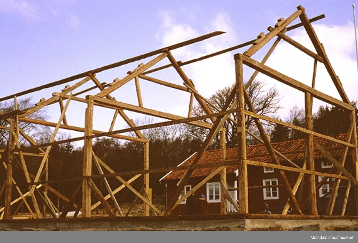 Titel: Långåkers lada, som har flyttats från Verner Carlssons gård i Tollered, återuppbyggs, april 1993.