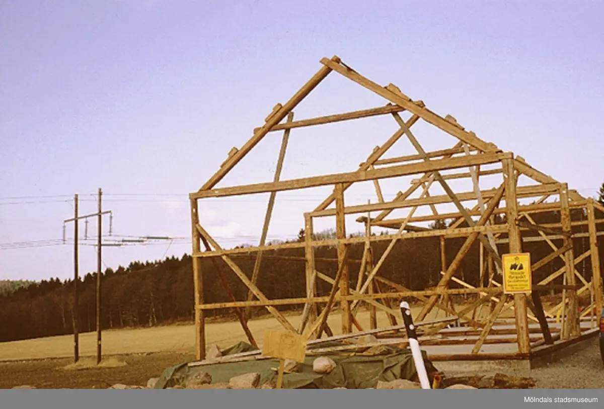 Långåkers lada, som har flyttats från Verner Carlssons gård i Tollered, återuppbyggs, april 1993.