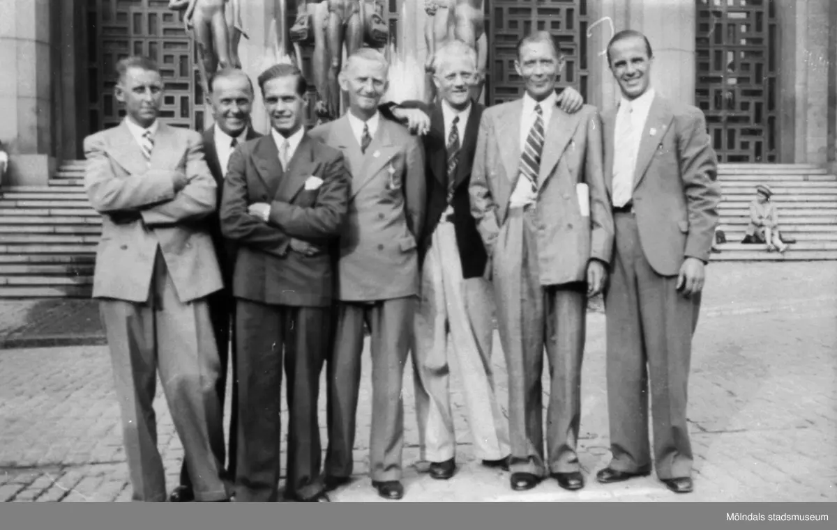 Sju kostymklädda män utanför Konserthuset i Stockholm 1931. Troligtvis representanter från Textilarbetareförbundet i Mölndal.