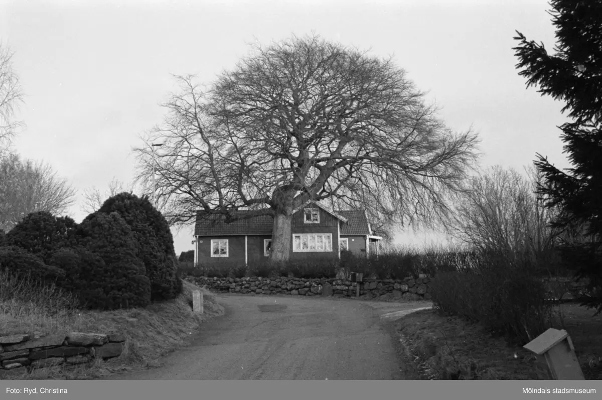 Ett stort träd framför ett hus på Lindomebyvägen 16, 1992.