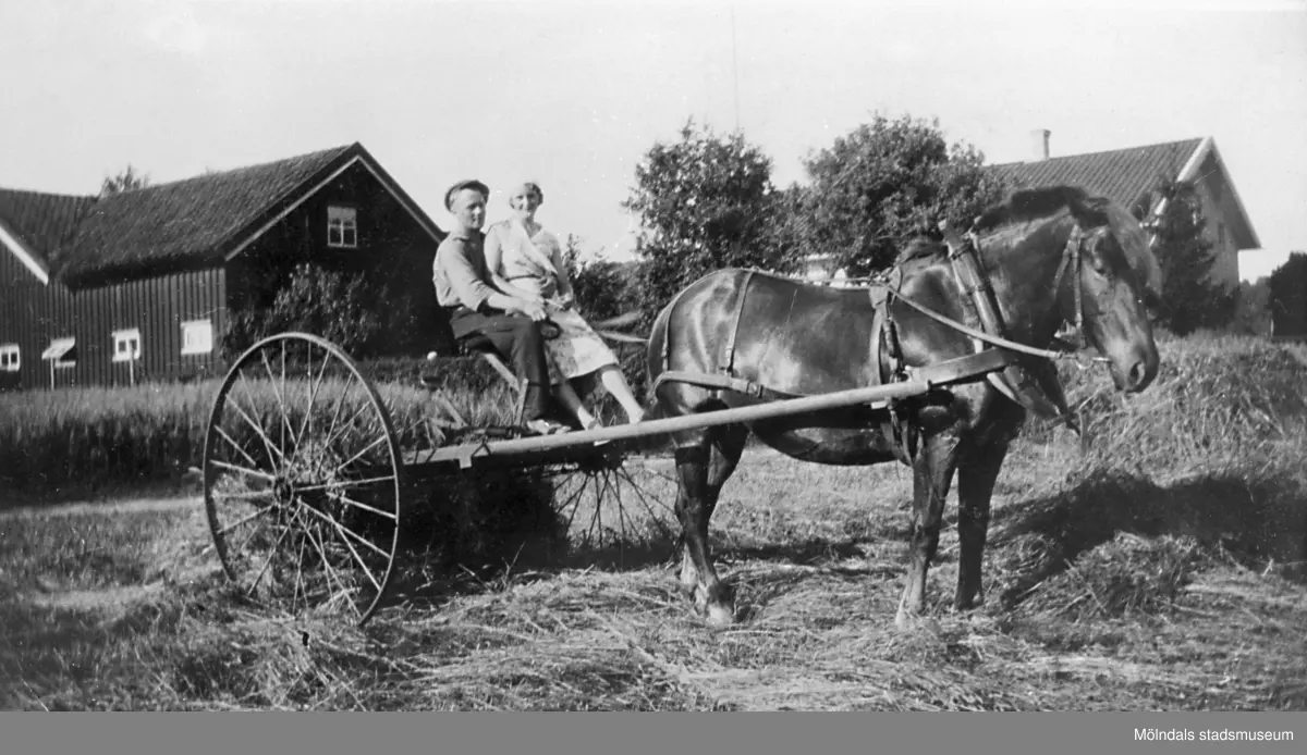Höräfsning med häst, Arvid Svensson och Linea Mattsson vid Nersgården, 1930 - och 40-talet.