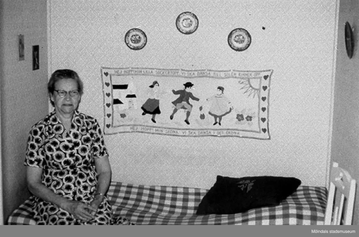 Brita sittandes på sin säng. Okänd plats och årtal.