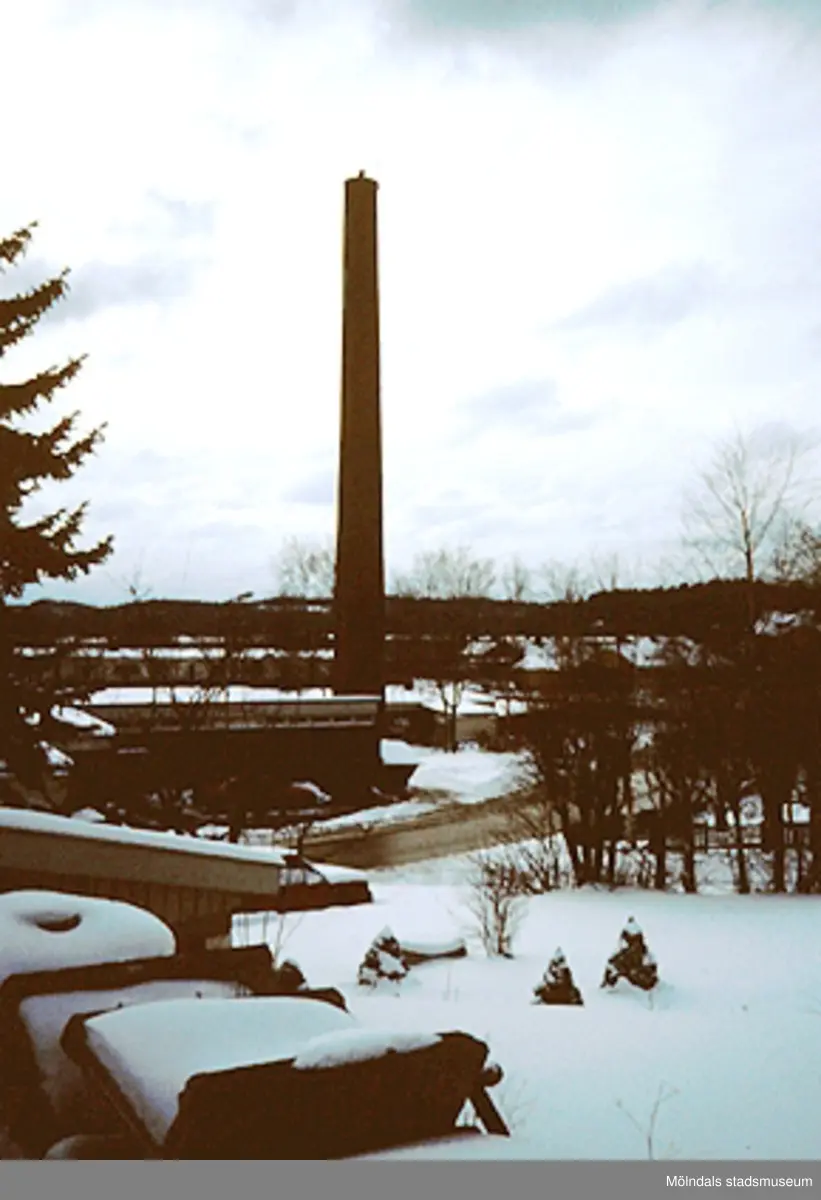 Byggnadsdokumentation av värmecentralskorsten i villaområde vid "Bräcka"/Fageredsvägen, mars 1994. Relaterat motiv: 2003_0038.