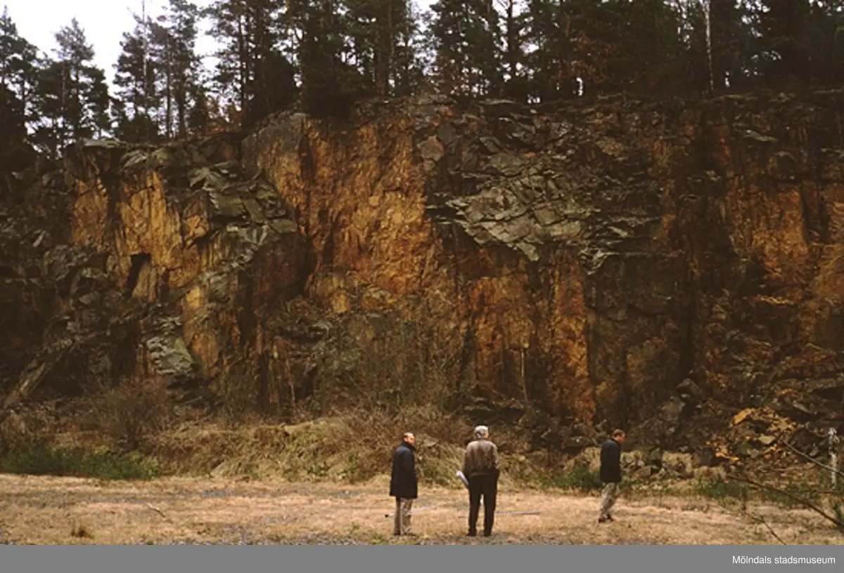 Tre män står nedanför ett berg, april 1993. Marken tillhör en gård söder om Lunnagården - vid Sisjövägen i Balltorp.