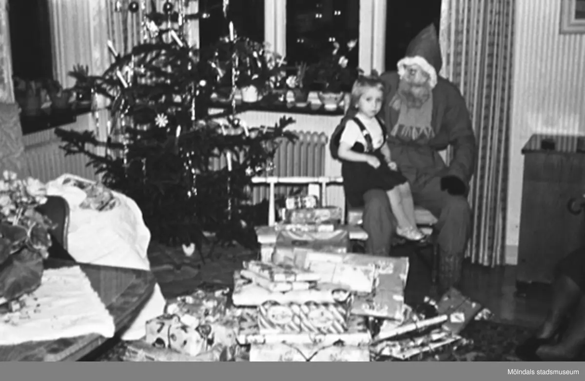 Jultomte med en flicka i knät och julklappar framför sig. Foto 1 är sv/v och foto 2 är i färg. Okända personer, plats och årtal.