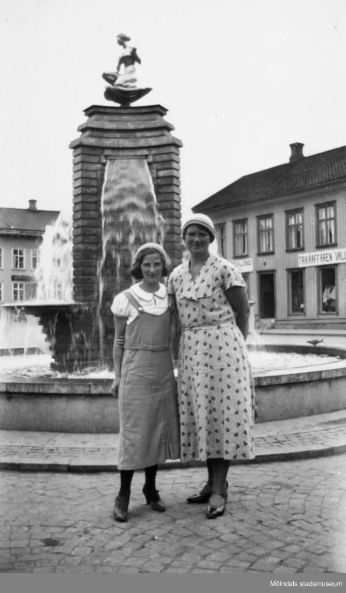 Helga och Inga står framför en fontän i Kungsbacka. 1930-tal.
