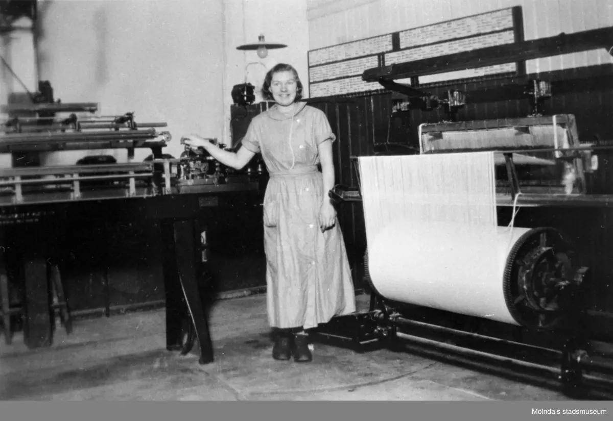 Karin Eliasson, syster till Anders Eliasson, står vid en knytmaskin.