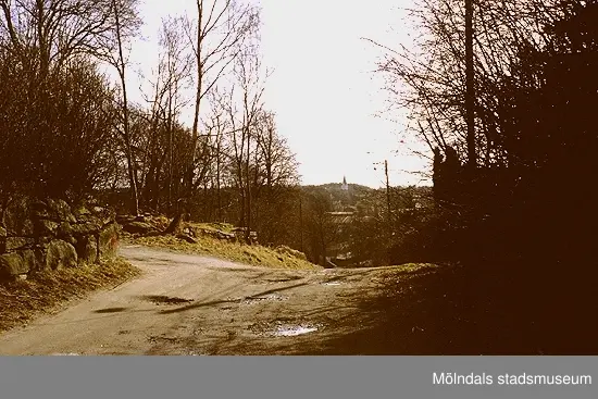 Annebergsvägen i Södra Lindome by, mars 1993. I fonden skymtas Lindome kyrka. Relaterade motiv: 2003_0379 - 0381.