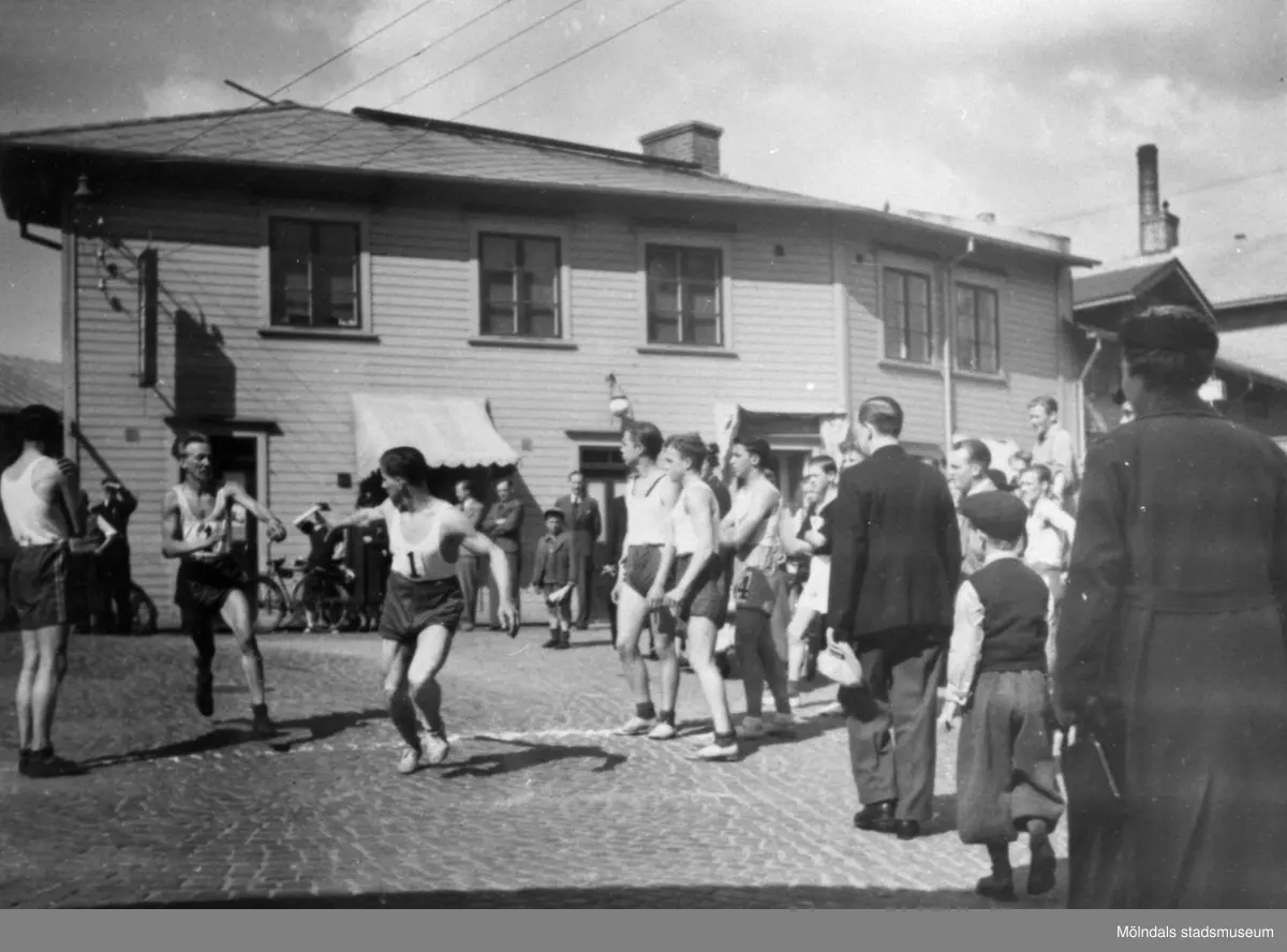 MSK (Mölndals stafettklubb). Stafett ”Mölndal runt” på Forsåkersgatan/Götaforsliden 1938. Forsells Cigarraffär i bakgrunden.