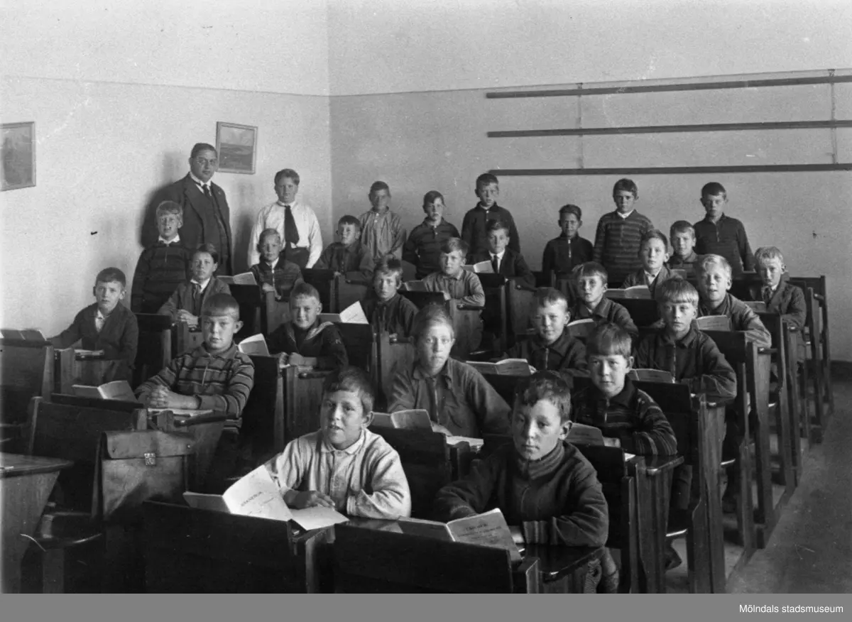 Pojkar sittande i bänkar med räkneböcker framför sig på Kvarnbyskolan i Mölndal år 1952.