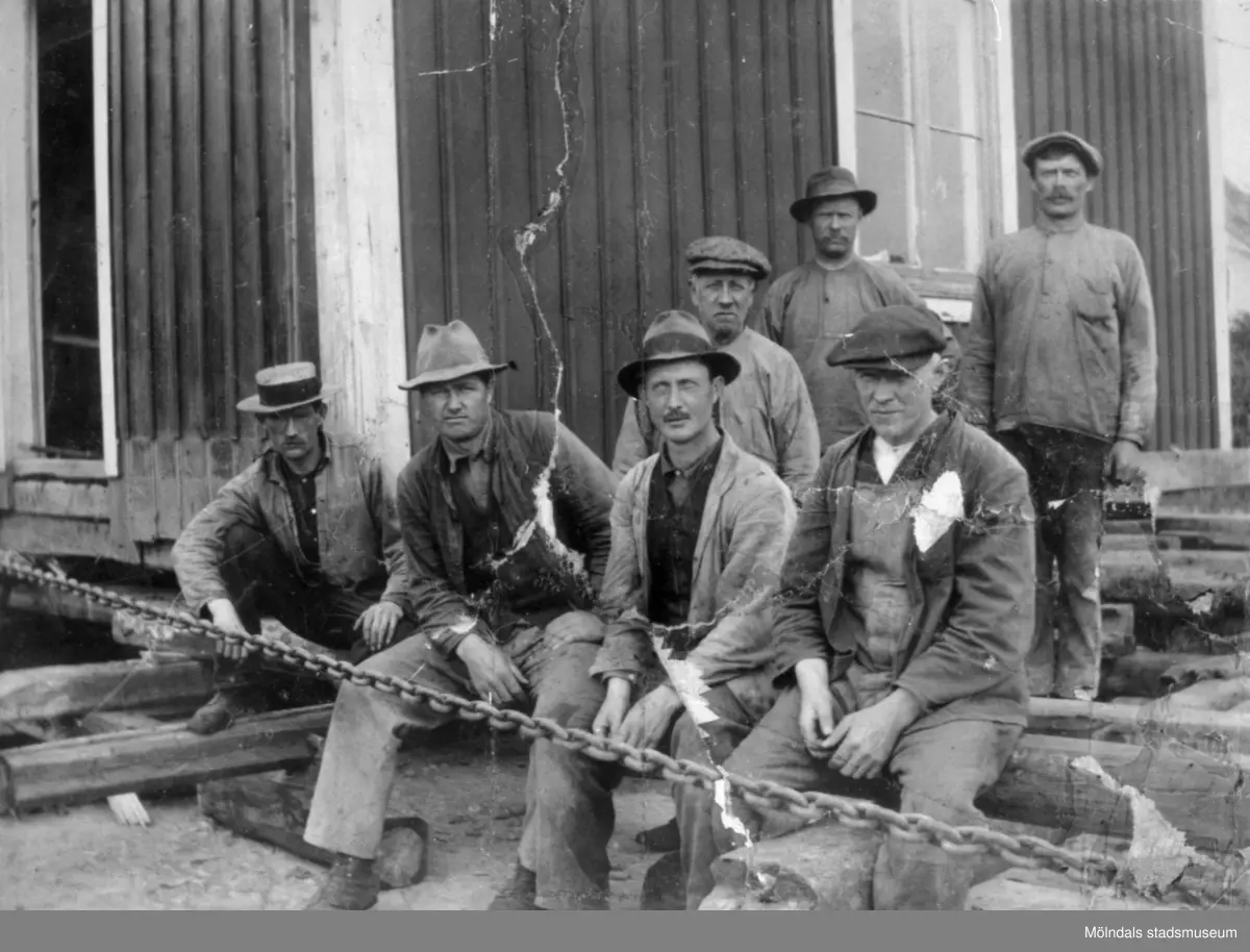 Porträtt av arbetare vid flyttningen av ett hus från Bö. Okänt årtal.