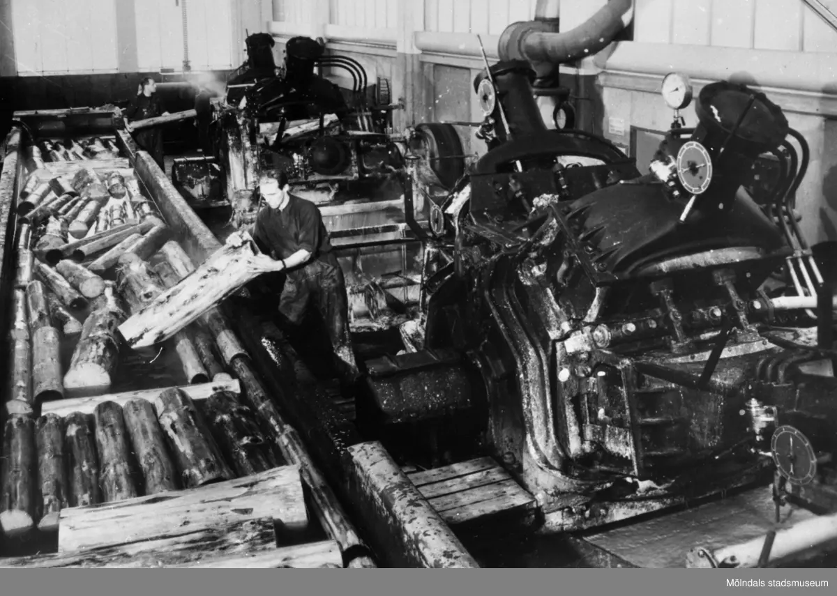 En man arbetar i sliperiet på Papyrus i Mölndal. Stockarna lyfts från rännan till slipmaskinen.
