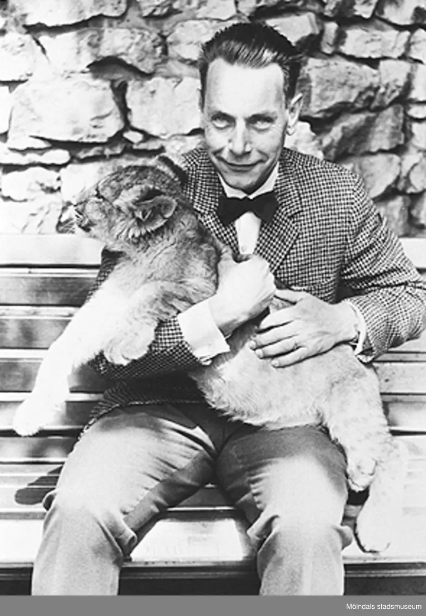 Porträtt av Erik Lennart Tengblad (1926 - 2009) med en lejonunge i sitt knä, okänt årtal. Son till Erik Nataniel Tengblad som startade Tengblads Tapetfabrik.