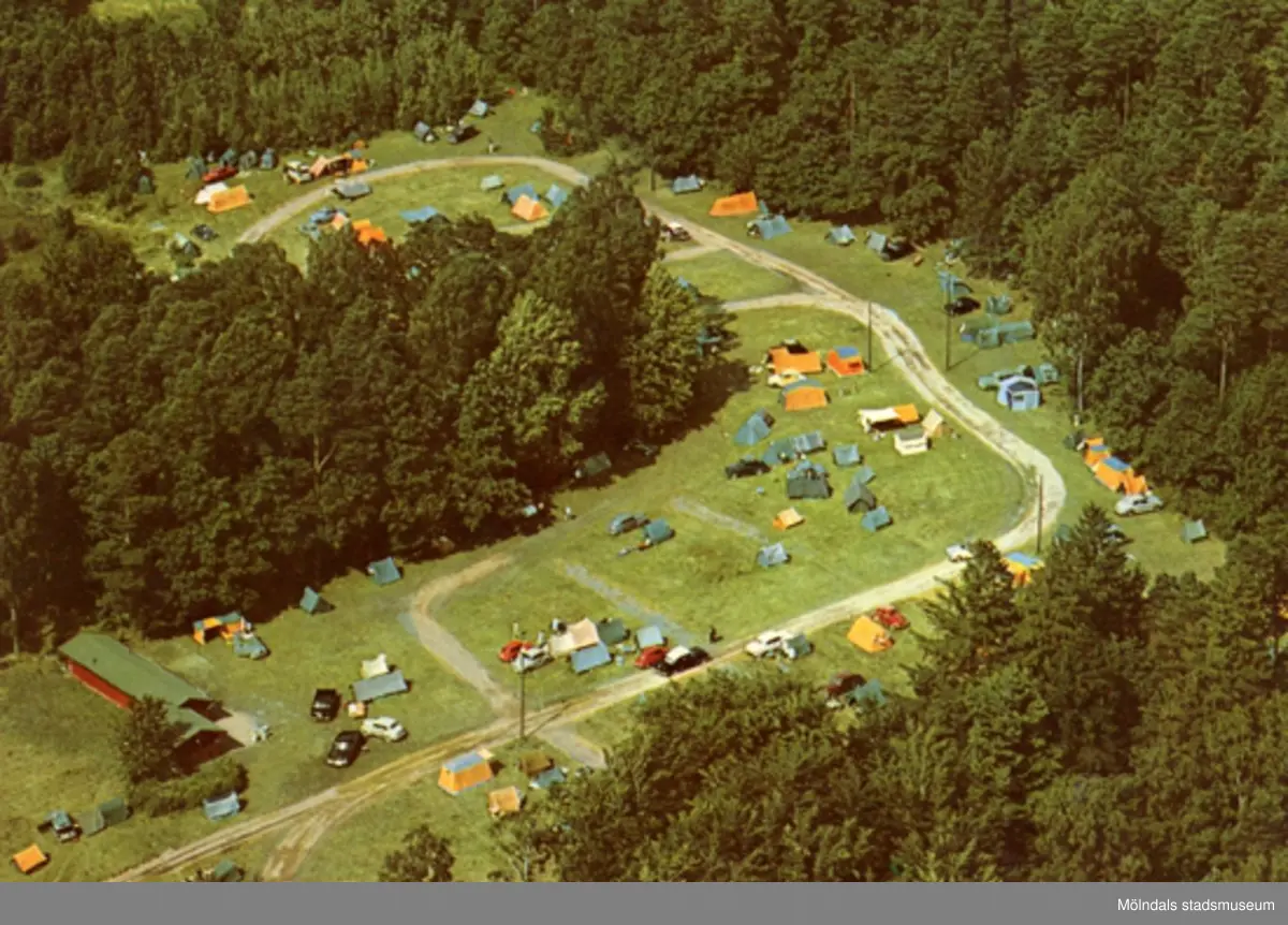 Ett avfotograferat vykort över Mölndal stads campingplats i Lackarebäck, okänt årtal.