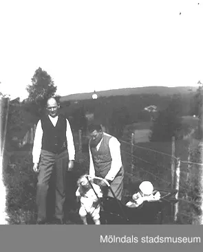 Toltorpsdalen i Mölndal. Två män och två barn, varav ett i barnvagn.