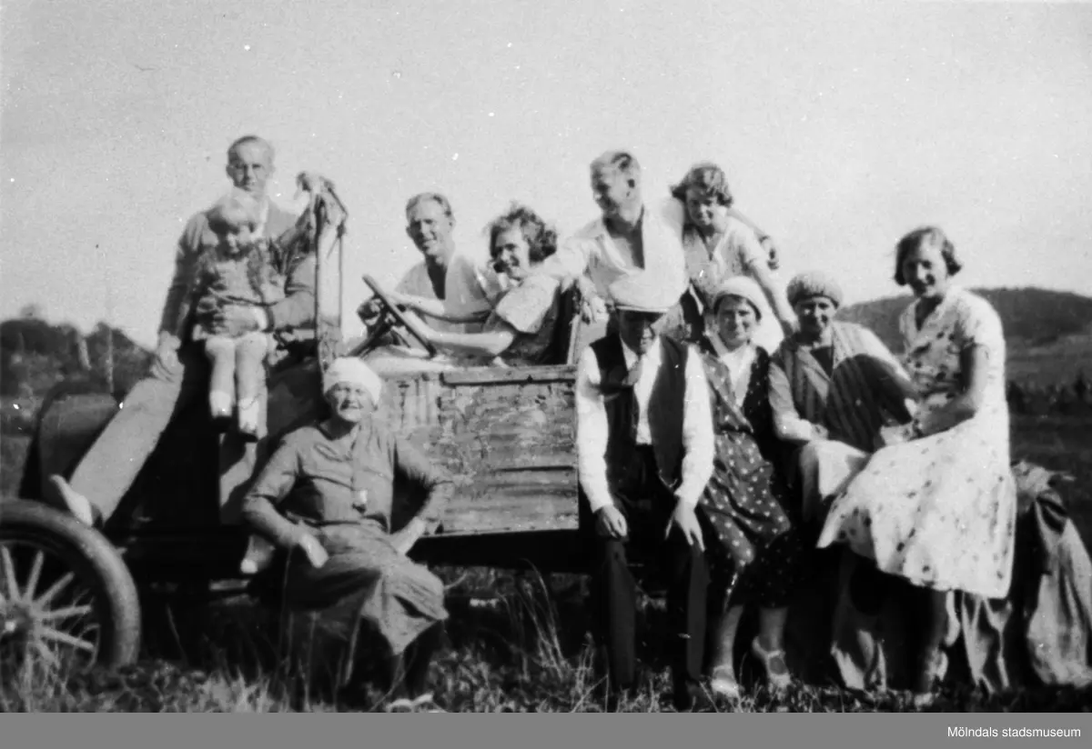 Kvinnor, barn och män sittande på en bil som står på en äng. Kållered 1930-tal.