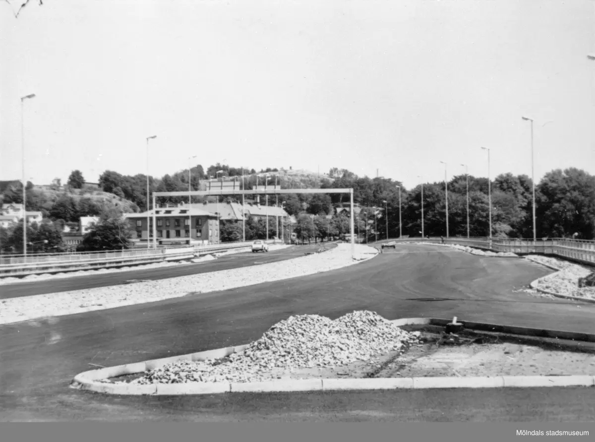 Bygget av Mölndalsbro 1975. Man ser Kvarnbygatsviaduktens vägbana mot öster. Till höger ses förbindelsevägen mellan bron och Gamla Kungsbackavägen.