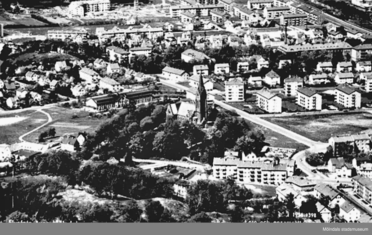 Vy över området vid kyrkan och över Bosgården. Man ser delar av Frölundagatan, Häradsgatan, Terrakottagatan, Växthusgatan och Knarrhögsgatan.