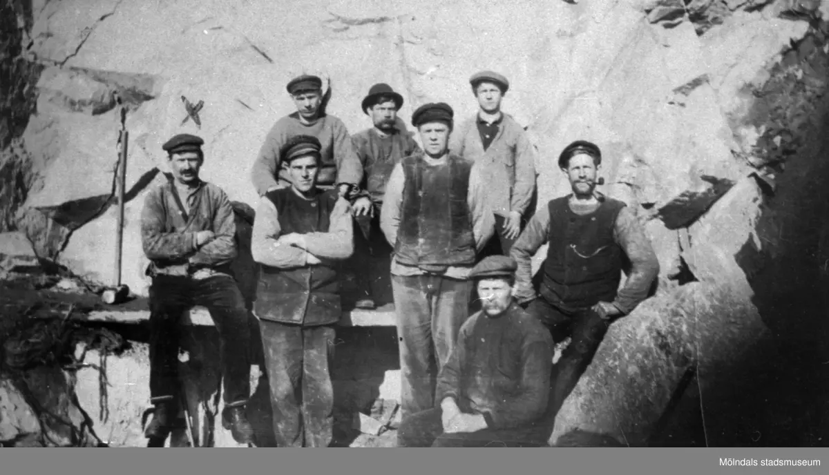 Uppställning av arbetare vid vägbygge i Toltorpsdalen under början av 1920-talet. På baksidan står "Felix pappa". Troligen markerad med kryss på bilden.