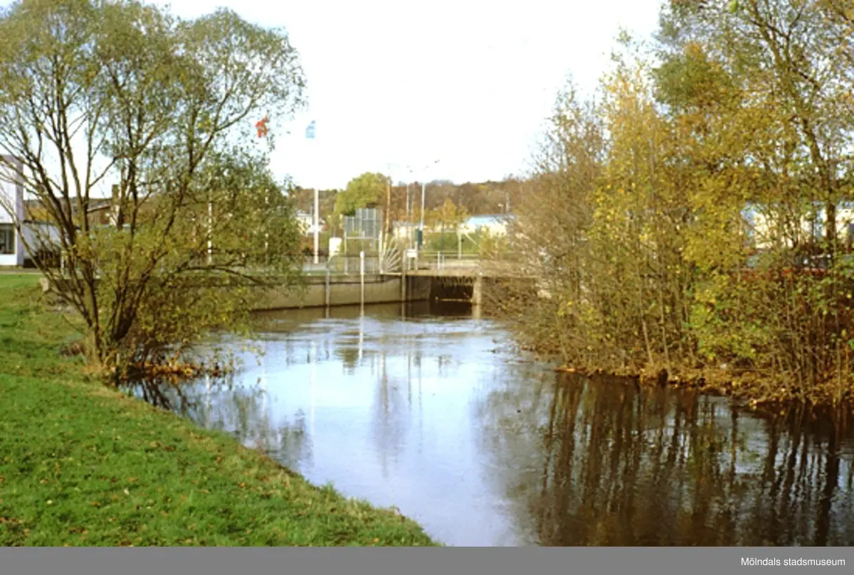 Kulvertingång i Balltorpsbäcken (som flyter ihop med Mölndalsån i centrum) norr om valvbron i Åbro, oktober 1993.