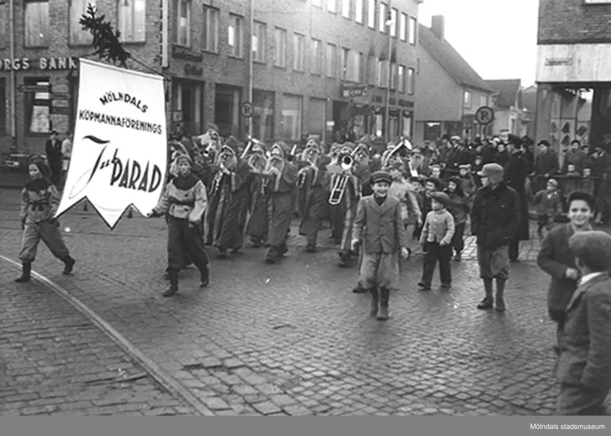 Mölndals Köpmannaförenings julparad i Mölndals centrum, troligtvis 1950-tal. Denna anordnades under många år. Frölundagatan (senare: Brogatan) ses i bakgrunden.