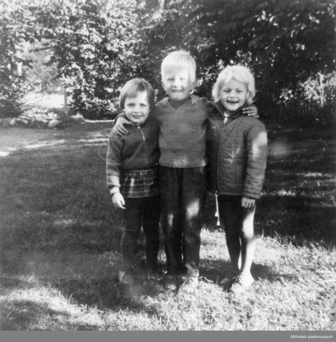 De tre barnen Carina, Jari och Agneta i trädgården på Brunnsgatan, 1965. De håller armarna om varandras axlar.