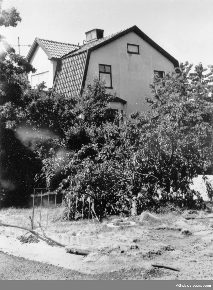 Rivning av området kring Mölndalsbro-bygget 1975. Man ser Ahlbergs skrädderi (Barnhemsgatan 16) från sydost, skymt av grönska.