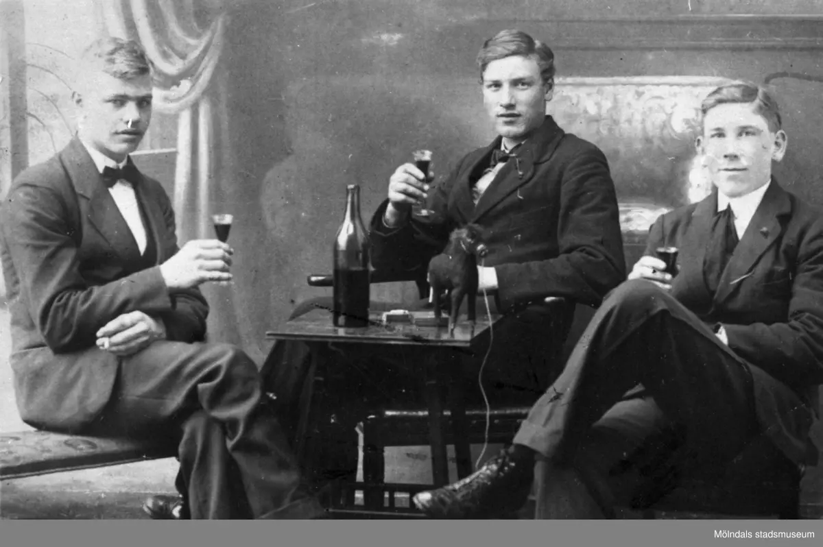 Tre män i kostym sitter runt ett bord med var sitt glas i handen. Från vänster: man med okänd identitet, Ivar Dahlberg och Willy Jansson. Mölndal, okänt årtal.