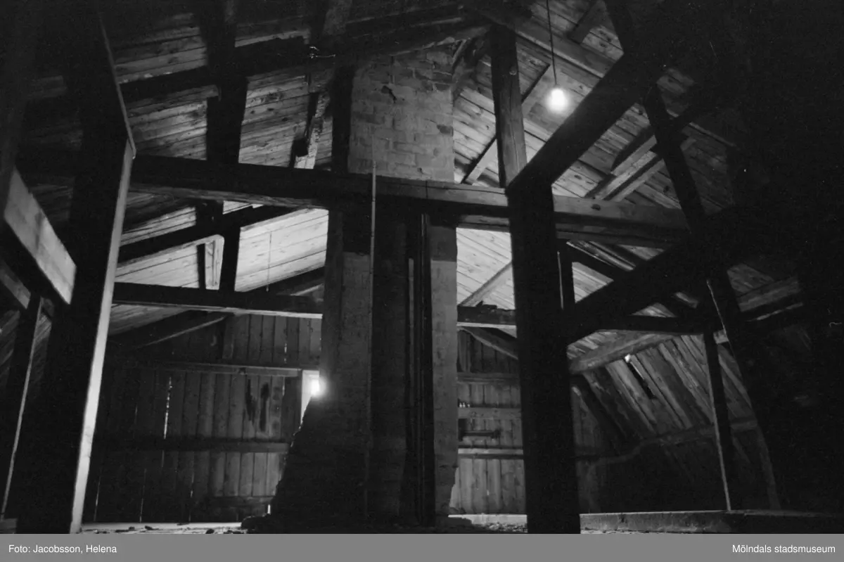Interiör: vindsloft. Träkonstruktion, "takstolar".
