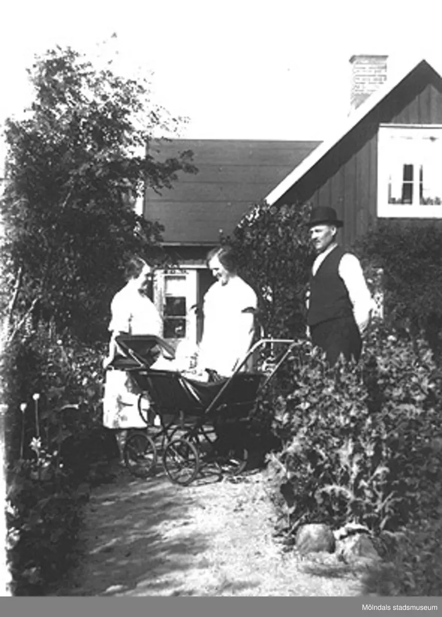 Fässbergsgatan 31 i Toltorpsdalen, Mölndal. Morbror Elis, mamma, moster och brodern i barnvagn.