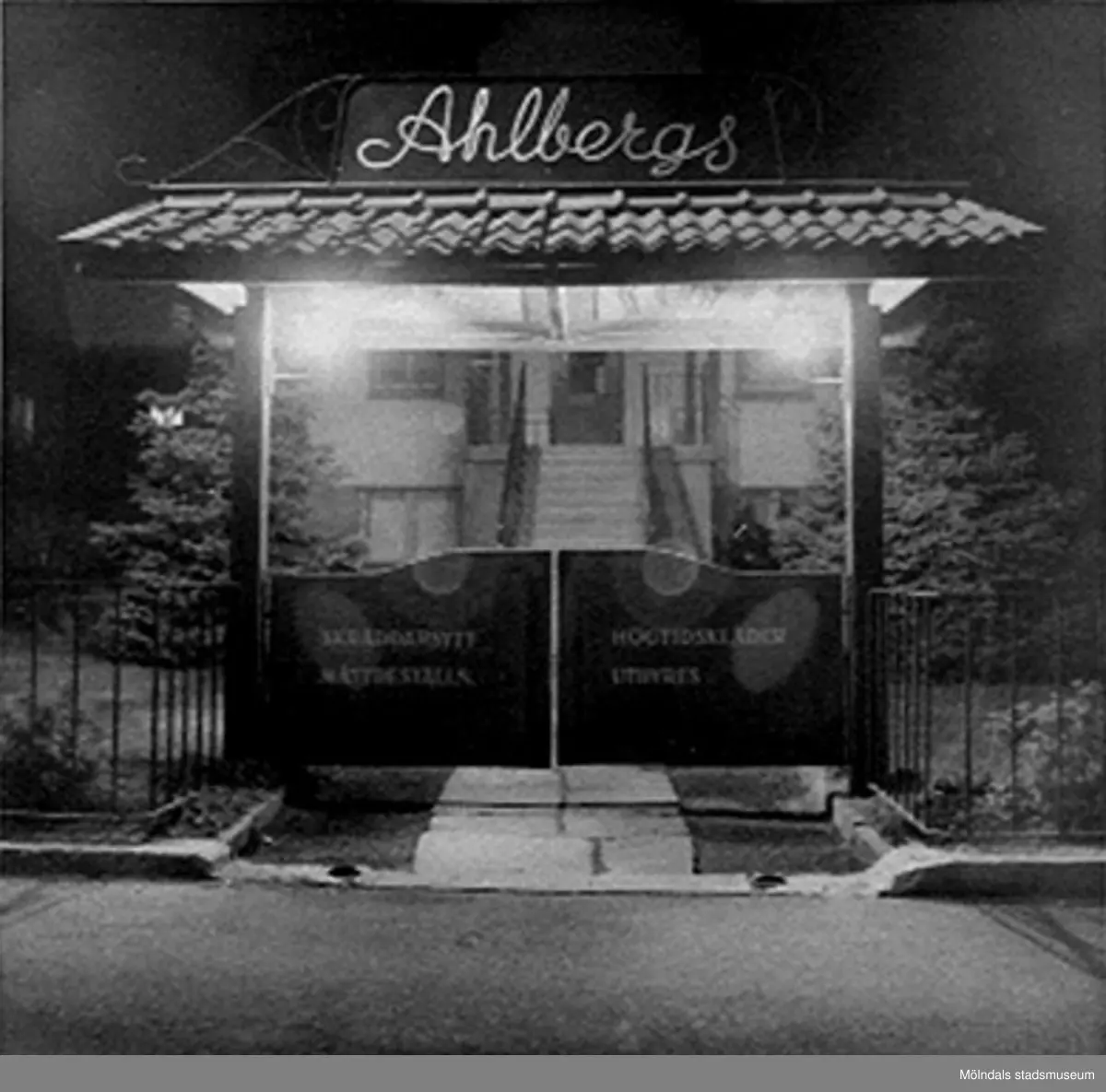 Ingångsporten vid tomtgränsen, Barnhemsgatan 16 (adressen finns inte kvar). Firmaskylt och reklam för Ahlbergs skrädderi. Bilden är tagen under 1960-talet.