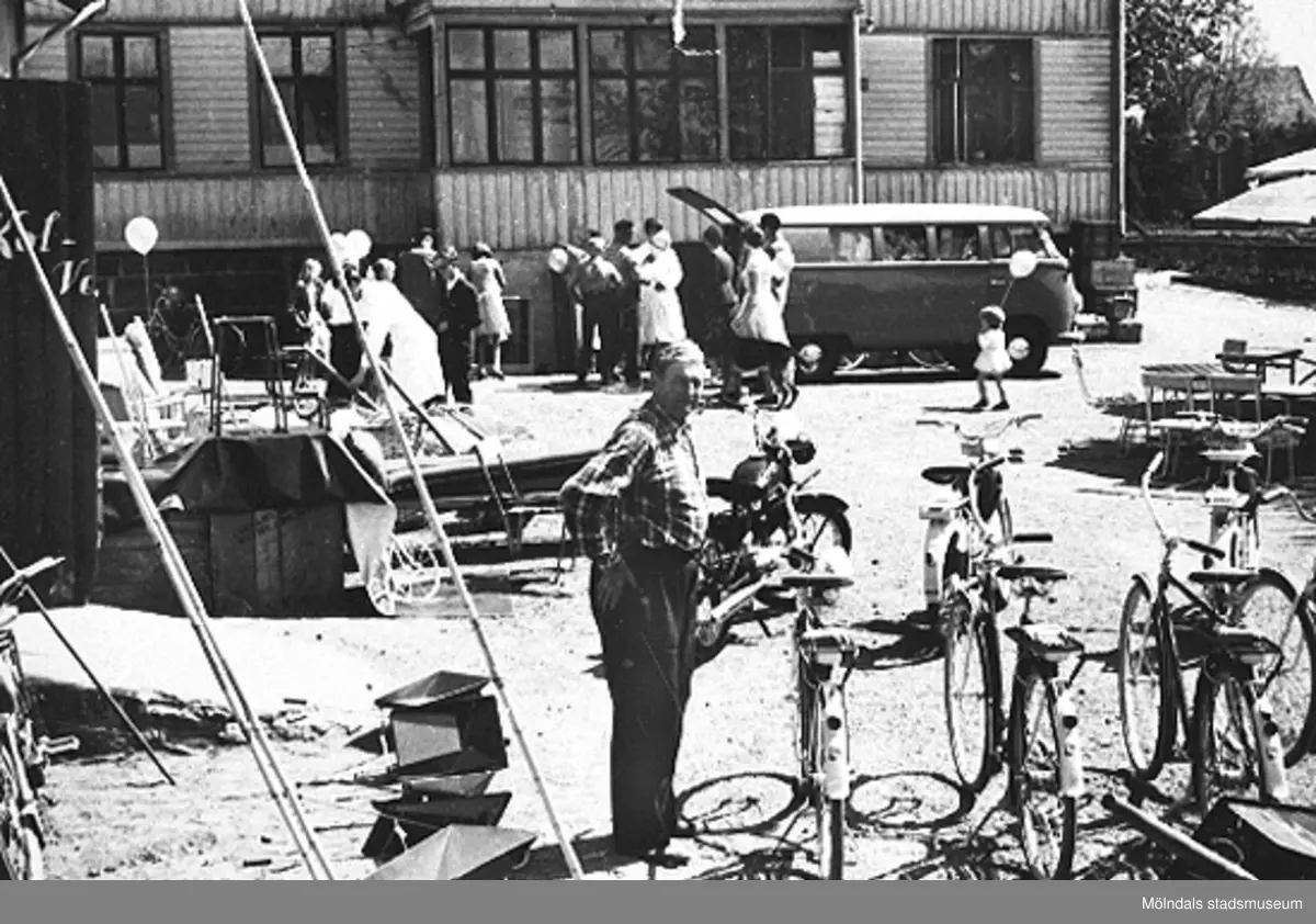 En man står på en gårdsplan bredvid några cyklar. I bakgrunden ses barn och vuxna som packar/packar ur en folkvagnsbuss framför ett stort hus. 1950-1960-tal.