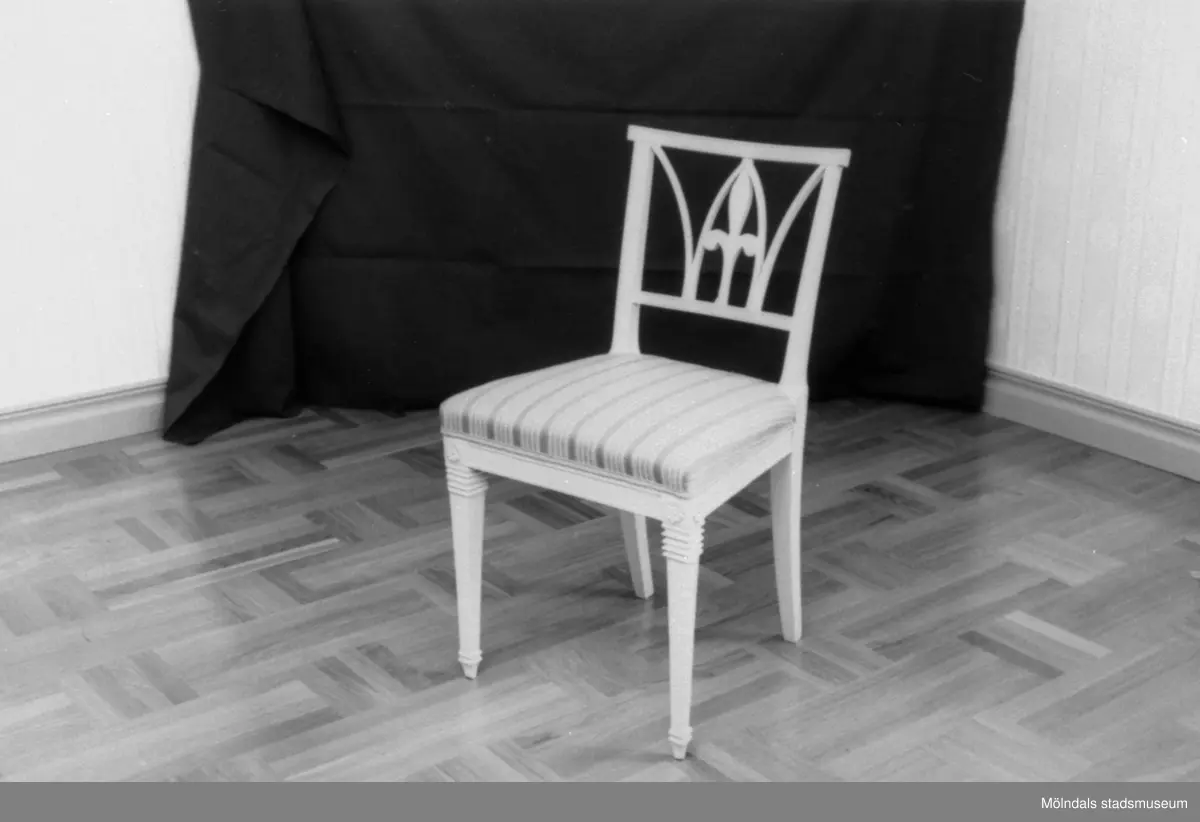 Vit, karmlös, klädd stol tillverkad av Nils Thorsson från Rösera i Lindome.