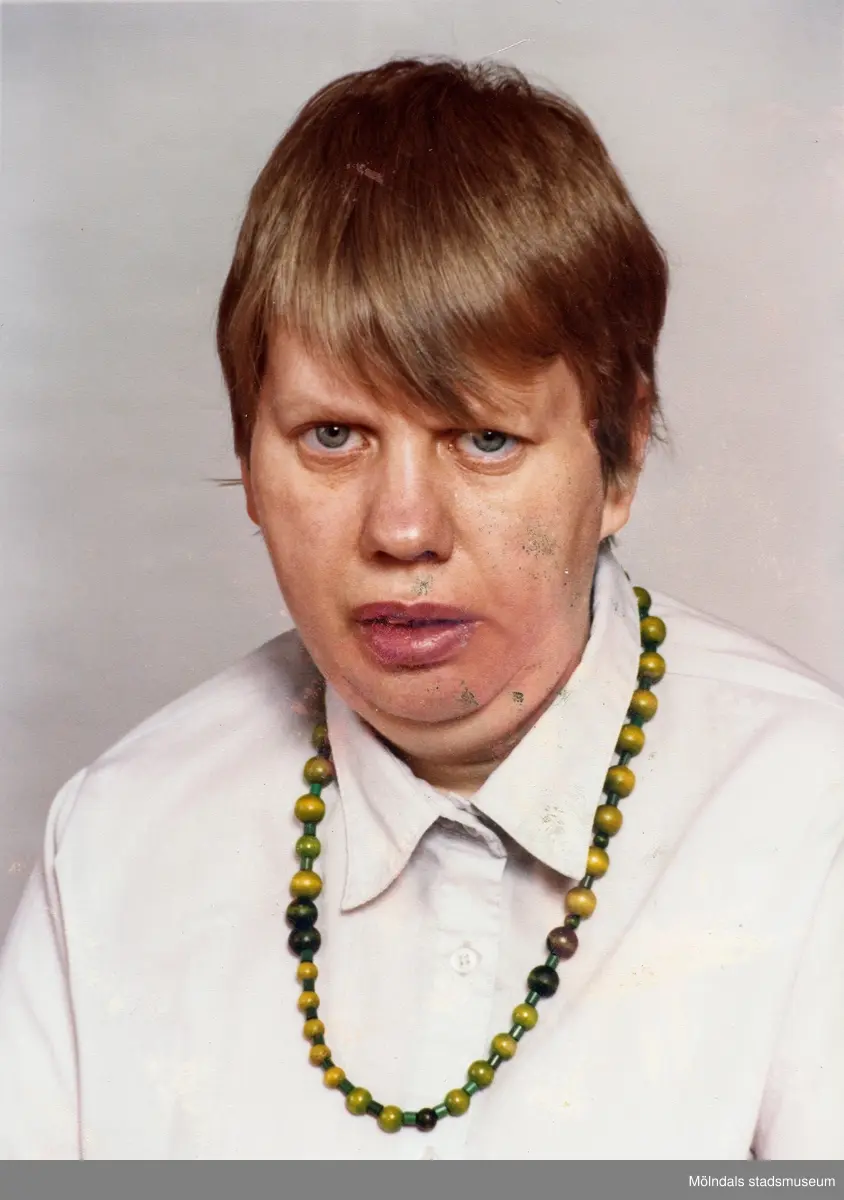 Porträtt av Maj Jernberg i vuxen ålder. Maj bodde på Streteredshemmet i Kållered troligen från 1970-1980-talet fram till början av 1990-talet.
