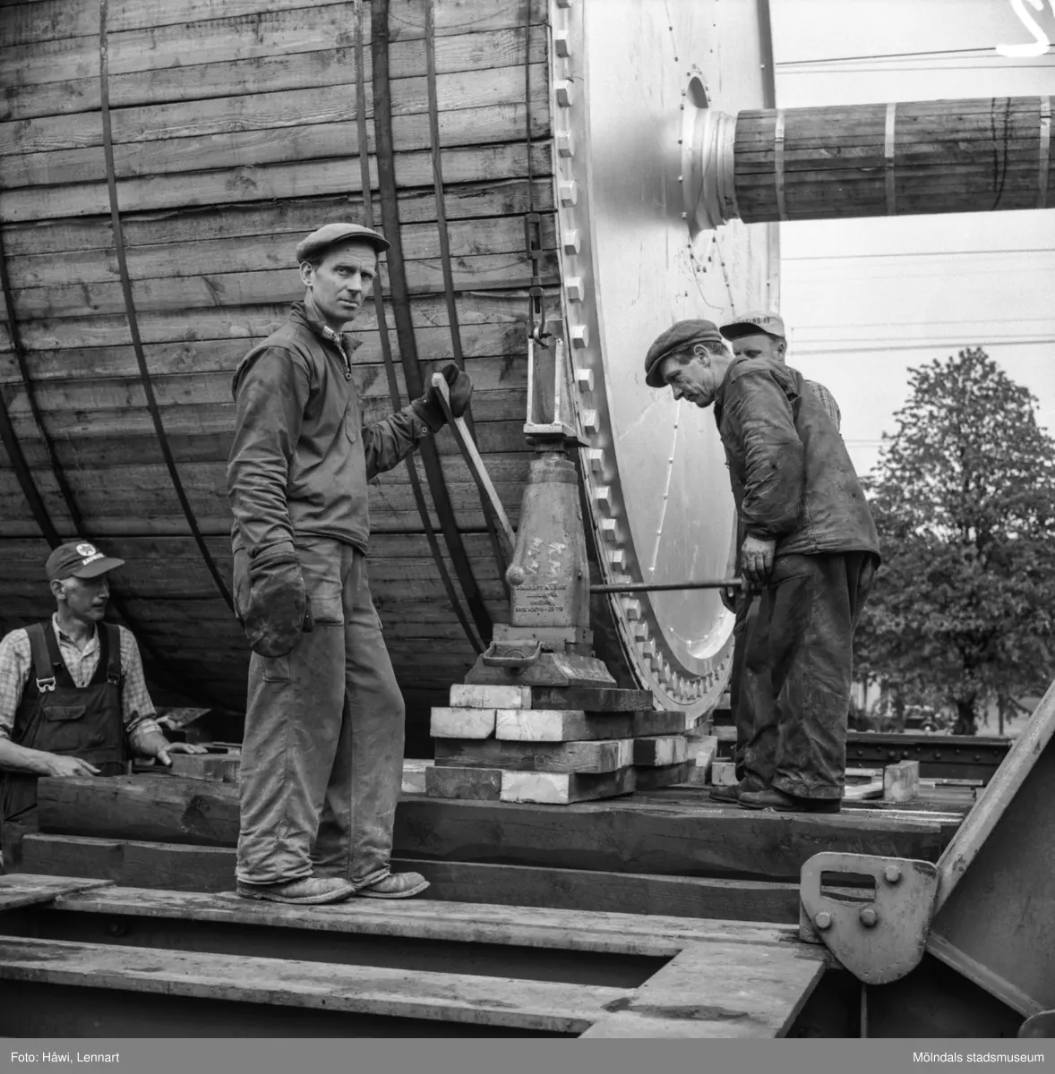 Transport av pappersbruket Papyrus PM2 yankeecylinder. Cylindern lastas från järnvägsvagn till lastfordon i Mölndal, 2/6 1956.