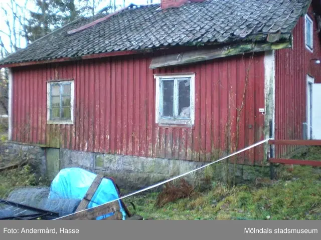 Det rödmålade Månstorpet, Sjövalla 1:118, i Mölndal. Fotografi taget den 9/11 2007. Byggnadsdokumentation inför rivning.
