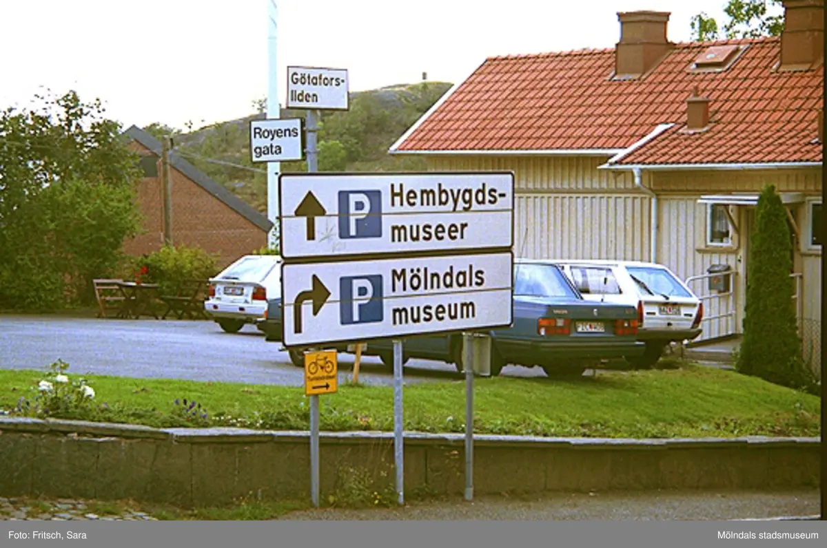2 st vägskyltar: Hembygdsmuseer och Mölndals museum i Mölndals Kvarnby, 1996.