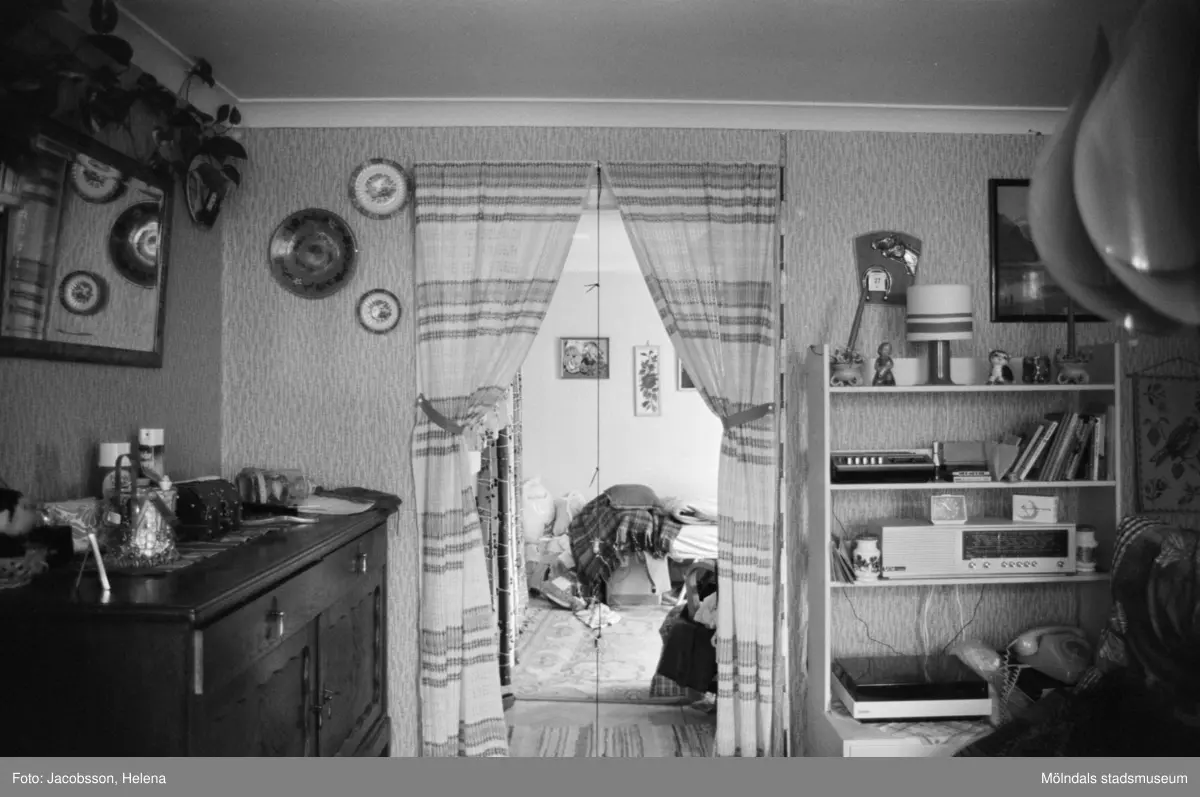 Titel: Interiörbild av bostadshus på Roten M 18 i Mölndals Kvarnby, 1972. Bostadshuset har en kvarvarande "brygga" utanför. Se bild 1991:1106.