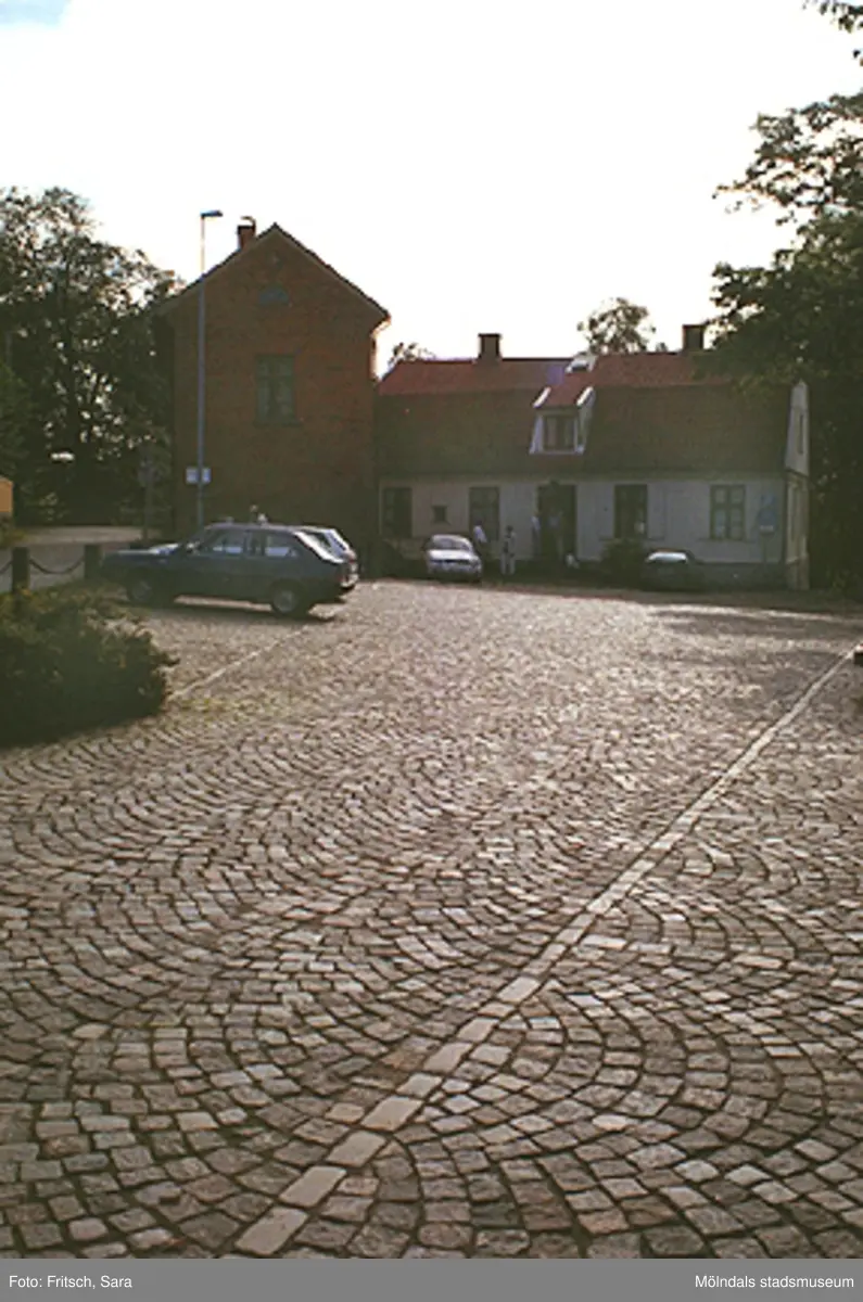 Parkeringsplats utanför Mölndals hembygdsgård i Mölndals Kvarnby, 1996.