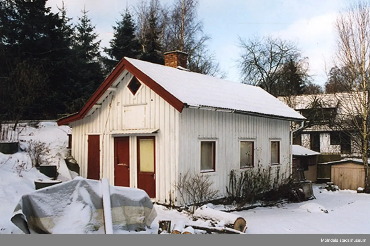 Tvättstuga med bostadshus i bakgrunden. Lyckebovägen 11 (Bölet 1:137) i Kållered år 1999.