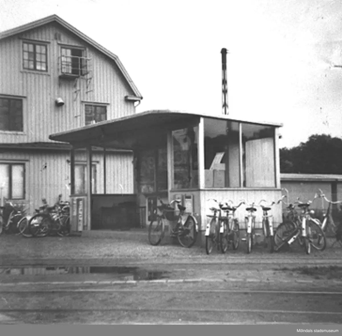 Vändslingan i Mölndals bro, 1940-talet. Parkerade cyklar står uppställda vid busskuren.