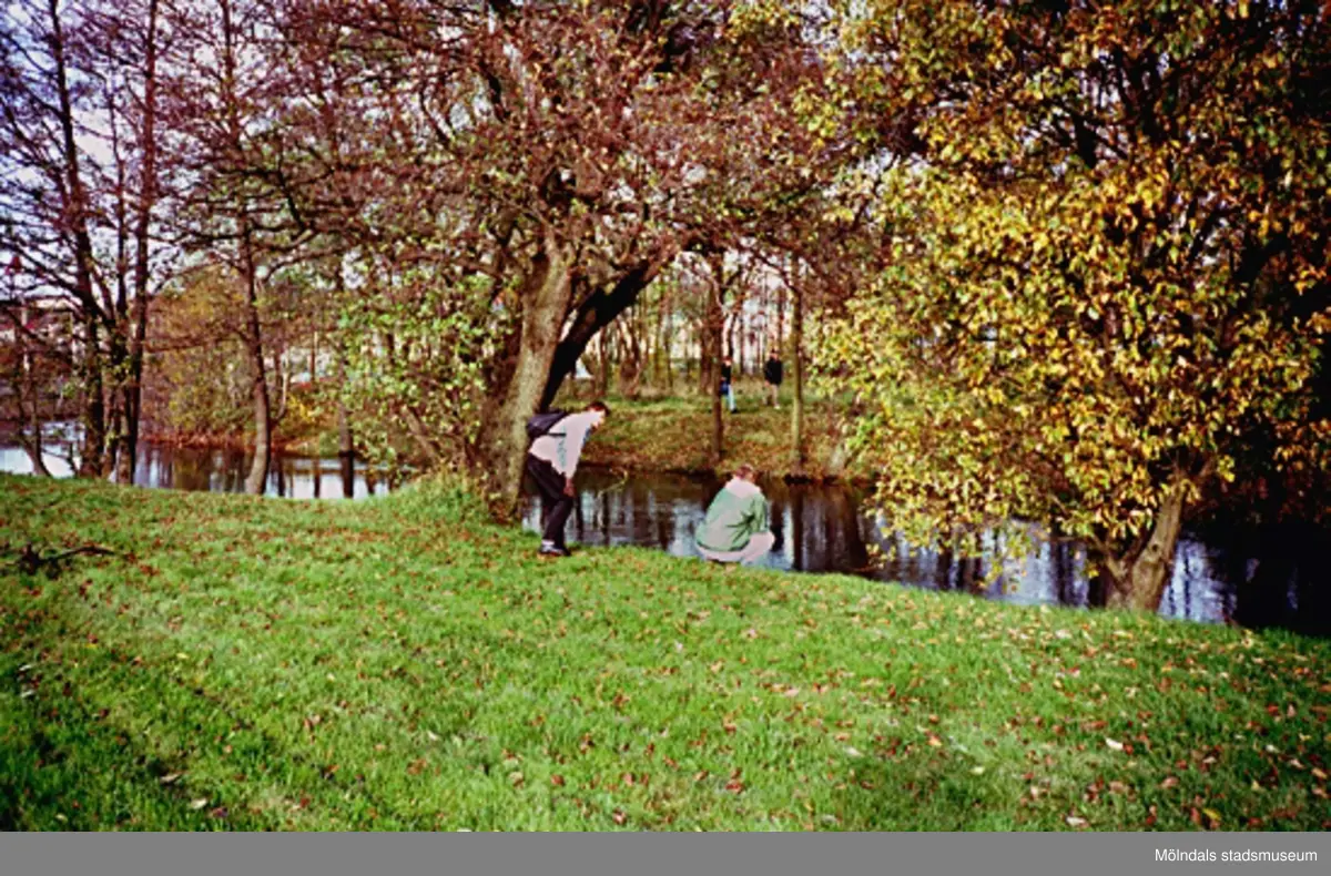 Foto taget utmed Mölndalsån år 1993. Två personer vistas vid kanten.