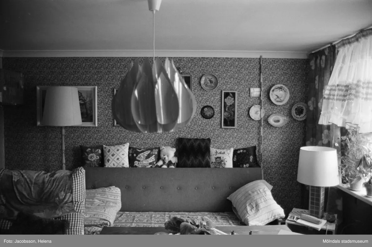 Titel: Interiörbild av bostadshus på Roten M 18 i Mölndals Kvarnby, 1972. Bostadshuset har en kvarvarande "brygga" utanför. Se bild 1991:1106.